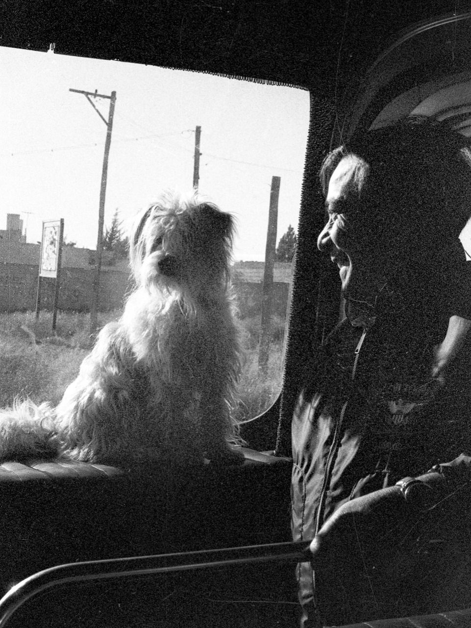 Fidel, el perro mascota de la gira, junto al chofer del micro. Foto capturada y cedida por Andón, aparecida en Revista Pelo N°63.